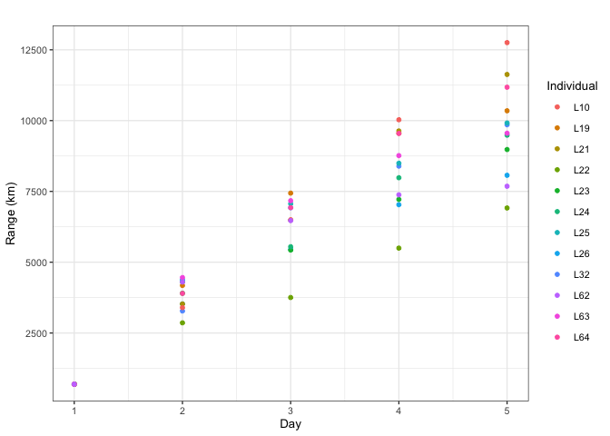 The Curlew Sandpiper is a small wader, breeding in Arctic Siberia and wintering in Africa (Cramp and Simmons 1983). A sample of 12 individuals was observed over five days in laboratory conditions (in total a sample of 60 observations) at the University of Gdańsk. Initially, all these individuals had no subcutaneous fat depots (fat score equal to 0) (Meissner 2009). Birds were fed ad-libitum with mealworm larvae Tenebrio molitor. To determine the maximum body mass gain sandpipers were weighed every day in the morning. The data set consists of body mass, fat mass, constant wingspan (0.44 m) and wing area (0.018 m2). Body mass and fat mass are converted from grams to kilograms. On day one, the fat fraction is assumed to be 0.05 according to the observations of closely related species - the Red Knot Calidris canutus (Piersma, Bruinzeel, Drent, Kersten, Van der Meer, and Wiersma 1996). On day 2 the fat fraction increases on average to 0.23, day 3 – 0.34, day 4 – 0.40 and day 5 – 0.44. Data collected in subsequent days were used to calculate the potential flight range of the studied individuals each day (Figure 4). On these data, the constant muscle mass migration simulation is used. The results return a named vector, if the bird identifier is not unique, the id suffix is added after an underscore. The results also return the speed at start and end of migration. All these estimates may be used in the analyses of inter-individual variation of potential flight range with increasing fat fraction in migrating birds.
