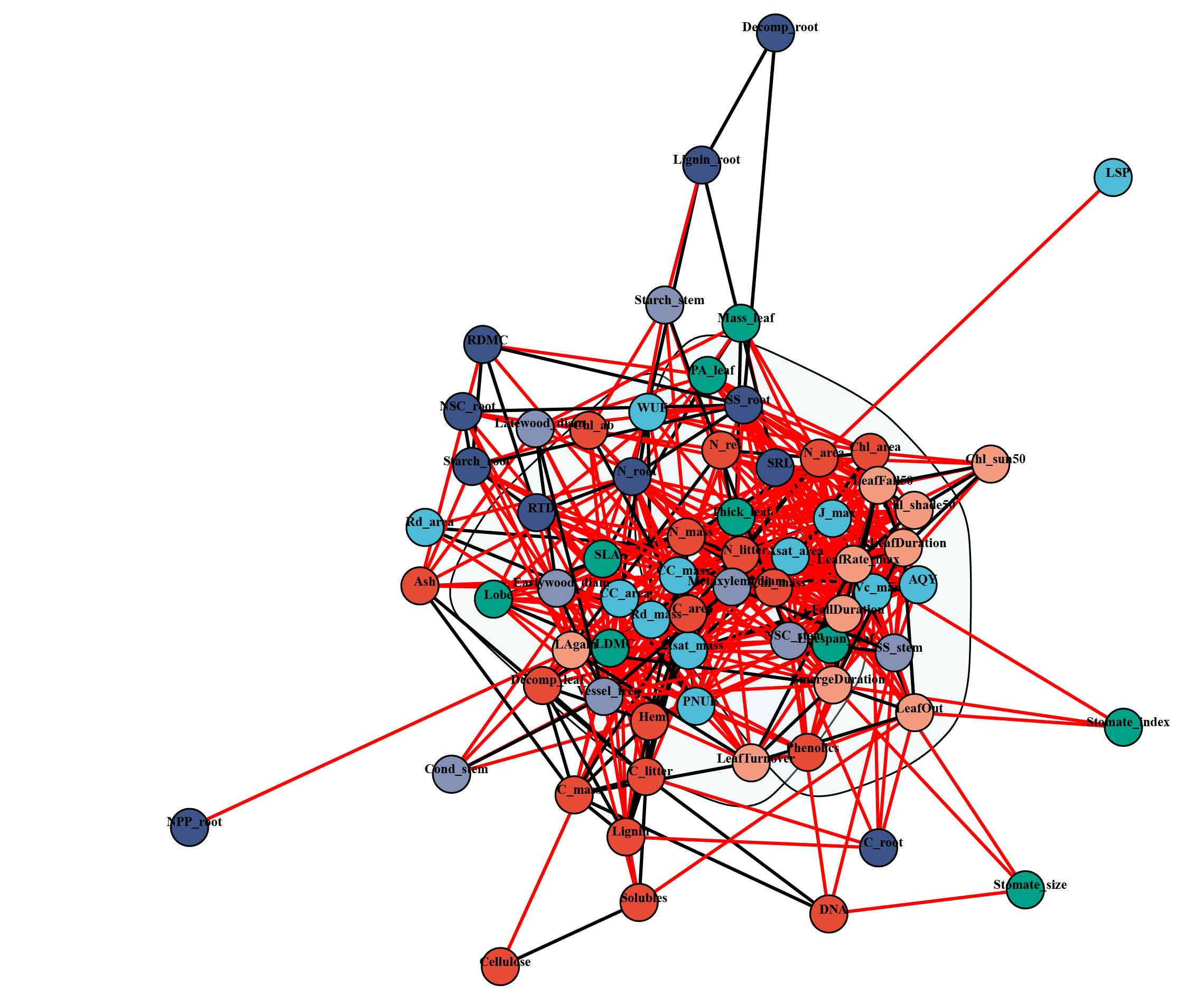 layers <- list( shoot_dynamics = c(“LeafDuration”, “LeafFall50”, “LeafRate_max”, “Chl_shade50”, “LAgain”, “FallDuration”, “LeafOut”, “Chl_sun50”, “EmergeDuration”, “LeafTurnover”), leaf_structure = c(“PA_leaf”, “Mass_leaf”, “Lifespan_leaf”, “Thick_leaf”, “SLA”, “Lobe”, “LDMC”, “Stomate_size”, “Stomate_index”), leaf_metabolism = c(“J_max”, “Vc_max”, “Asat_area”, “CC_mass”, “LSP”, “AQY”, “CC_area”, “Rd_area”, “Asat_mass”, “WUE”, “Rd_mass”, “PNUE”), leaf_chemistry = c(“N_area”, “Chl_area”, “DNA”, “Phenolics”, “Cellulose”, “N_mass”, “N_litter”, “Chl_ab”, “Chl_mass”, “N_res”, “C_litter”, “C_area”, “C_mass”, “Ash”, “Lignin”, “Solubles”, “Decomp_leaf”, “Hemi”), root = c(“NPP_root”, “SS_root”, “SRL”, “RTD”, “RDMC”, “NSC_root”, “Decomp_root”, “Starch_root”, “C_root”, “N_root”, “Lignin_root”), stem = c(“Latewood_diam”, “Metaxylem_diam”, “Earlywood_diam”, “NSC_stem”, “Vessel_freq”, “SS_stem”, “Cond_stem”, “Starch_stem”) )
