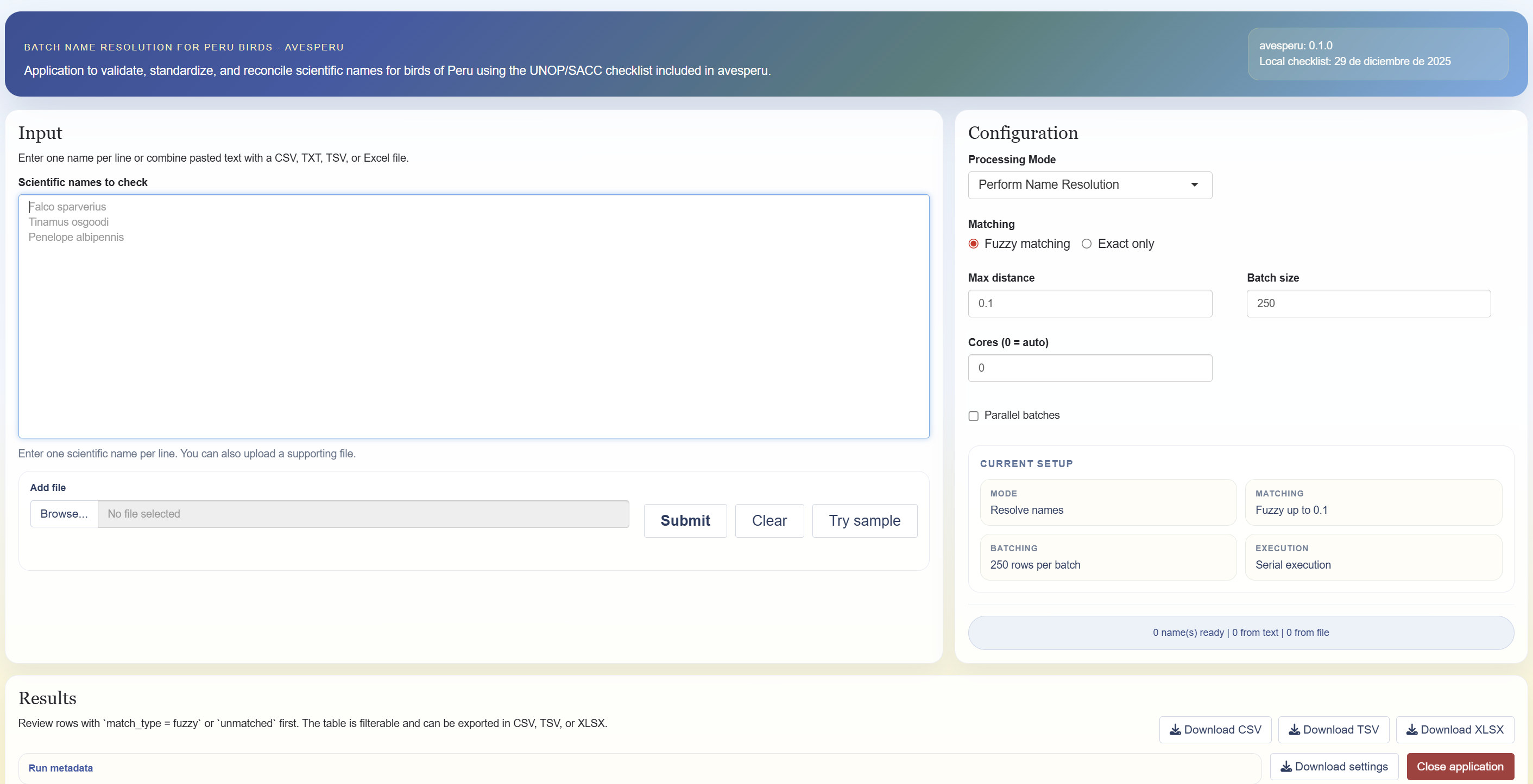 The package includes an interactive Shiny application for batch scientific-name validation against the local avesperu checklist. The app supports pasted names, file upload (TXT, CSV, TSV, XLS, XLSX), exact or fuzzy matching, review tables, and export to CSV, TSV, XLSX, and run metadata.