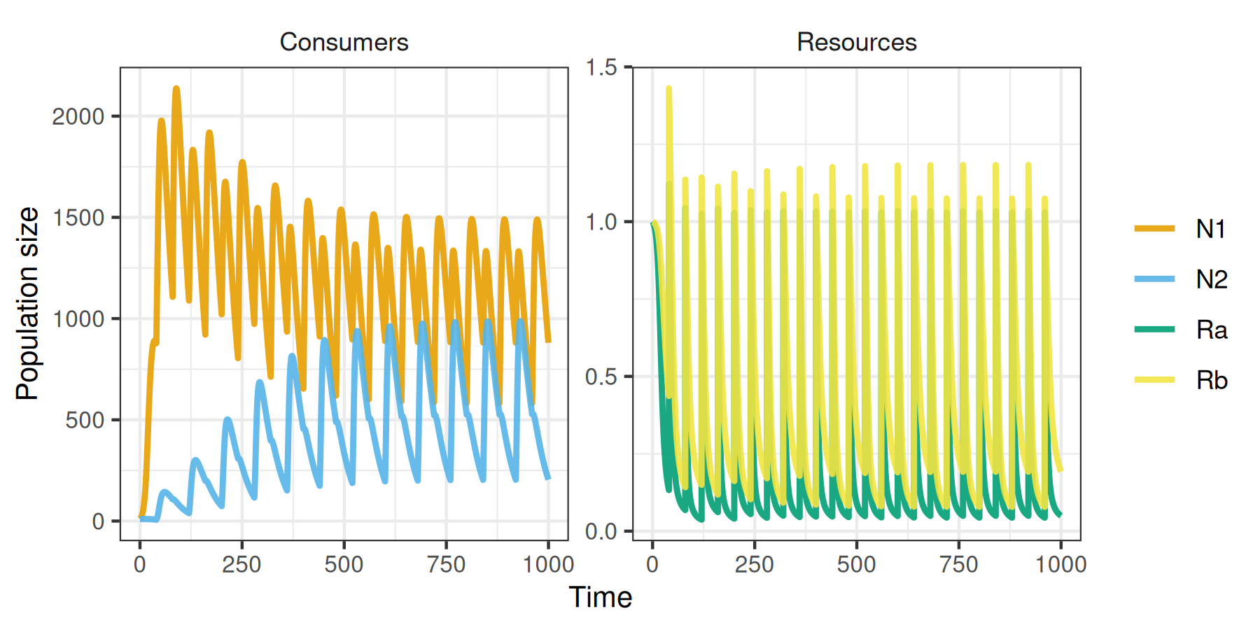 The following two examples demonstrate how to build and simulate a model for: i) two consumers with type II functional responses on a single logistically growing resources; and ii) two consumers with type III functional responses with pulsed resources and time dependent growth parameters. A wide range of other examples can be found in the package vignettes.