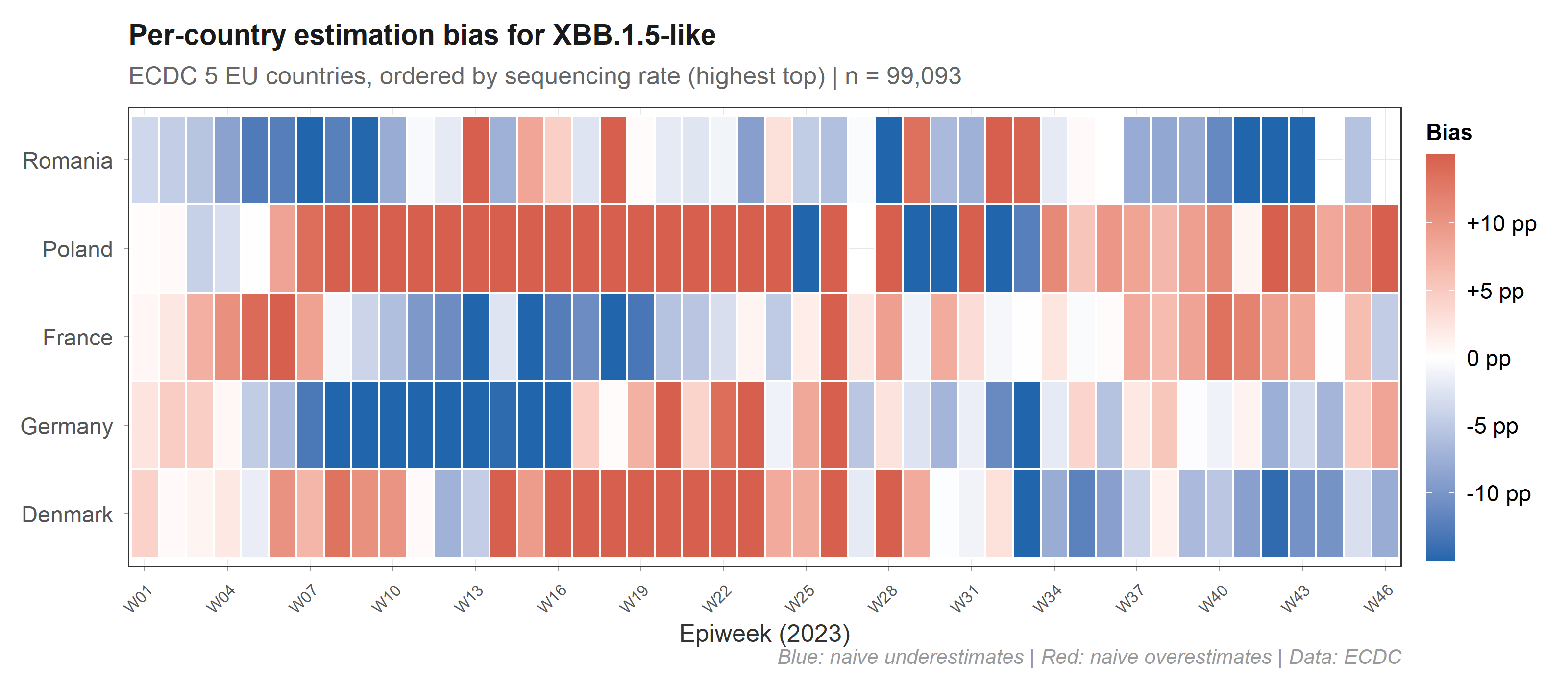 Each country’s bias depends on its sequencing rate and its local prevalence, and both change over time. Poland (under-sequenced, high prevalence) is systematically underweighted by naive methods. A single correction factor cannot fix this — you need per-stratum, per-period weights.